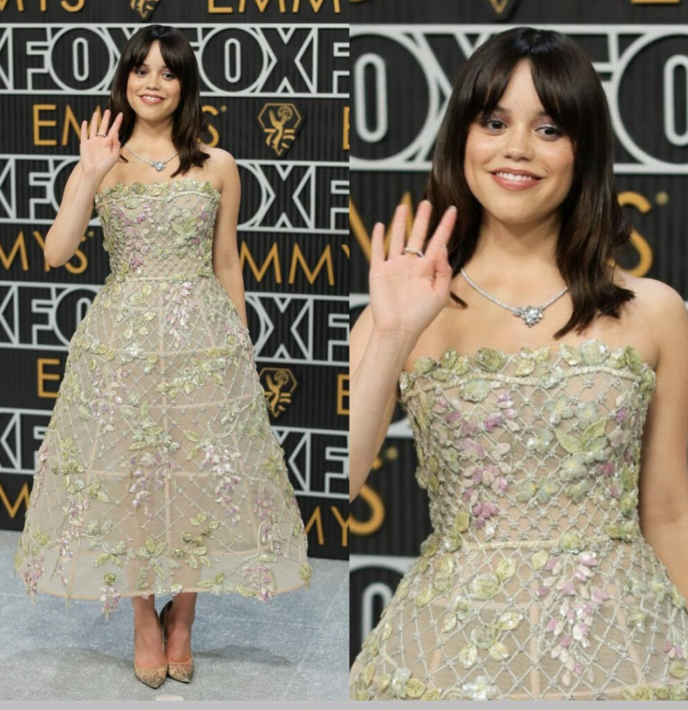 Un diseño de flores, romántico y muy femenino, así es el modelo que eligió Jenna Ortega para caminar por la red carpet de los Emmys.