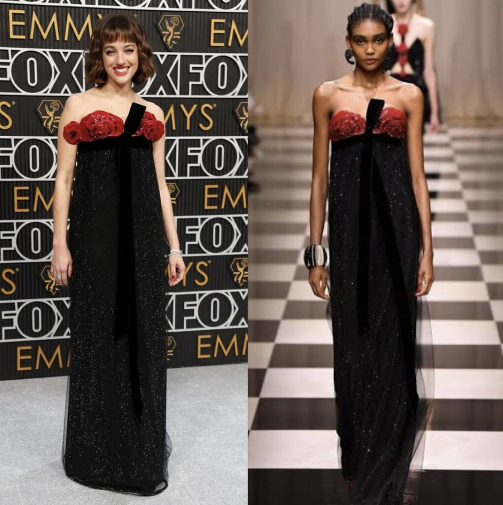 La actriz de The White Lotus Meghann Fahy usó un vestido bordo strapless con detalle de flores de terciopelo de la firma Armani Privé. Un diseño que combinó con joyas de Bulgari.