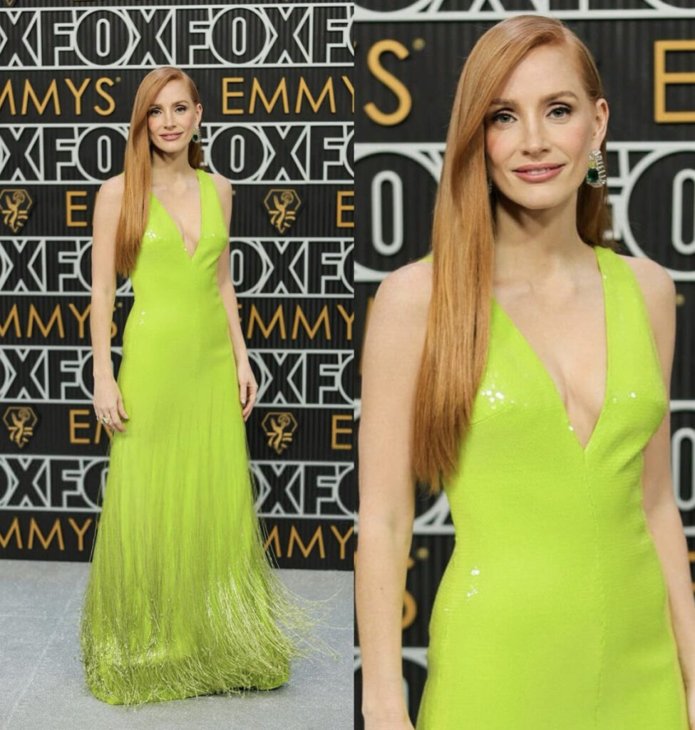 Jessica Chastain deslumbró con un diseño a la medida de Gucci en color verde lima. Uno de los tonos más usados de la noche.