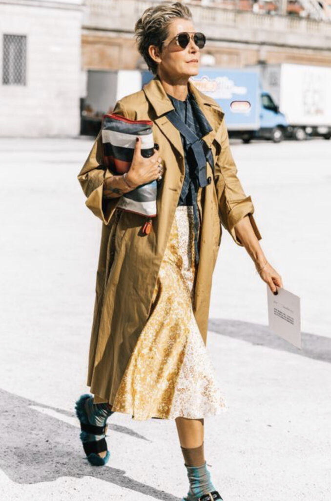 Falda, camisa, trench, medias y sandalias. El look podía ser clásico hasta que llegamos a sus pies, en los que lleva la combinación más canchera y cómoda de la temporada. Solo hay que animarse a implementarla.