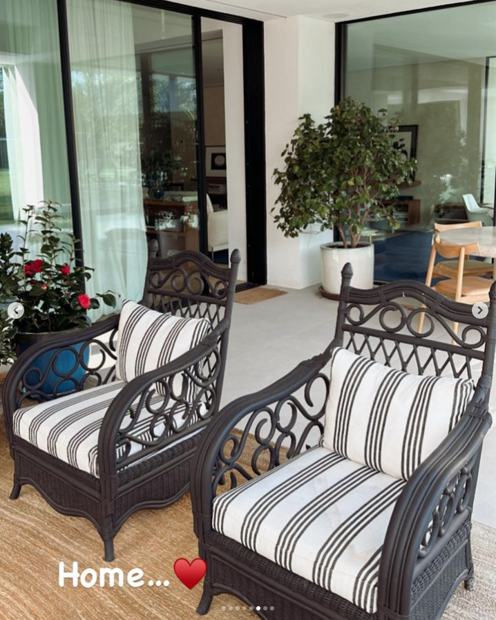 La esposa del Cholo también compartió una imagen de su galería techada y del living con muebles de exterior. "Home" ("Hogar"), escribió en la foto donde se ven dos sillones de caño con almohadones en composé blanco y gris, ubicados sobre una alfombra de esterilla, al lado de maceteros con plantas. Detrás, se llega a divisar un juego de comedor de madera clara.