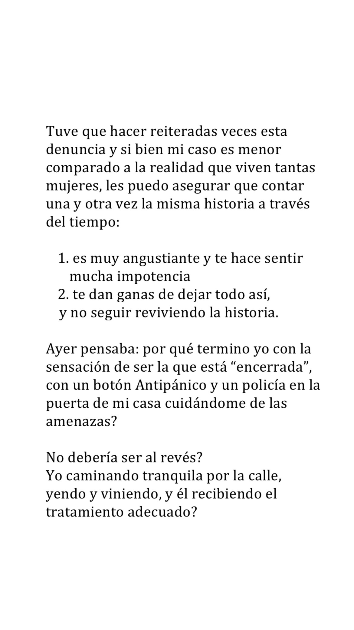 Allí, la actriz se sinceró con los sentimientos que esto le genera. "Ayer pensaba: por qué termino yo con la sensación de ser la que está “encerrada”, con un botón Antipánico y un policía en la puerta de mi casa cuidándome de las amenazas? No debería ser al revés? Yo caminando tranquila por la calle, yendo y viniendo, y él recibiendo el tratamiento adecuado?", se lamentó.