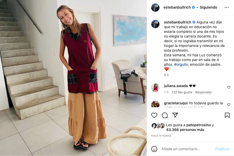 Esteban Bullrich compartió con sus seguidores de Instagram un posteo donde habla del orgullo por el logro de Luz, la mayor de sus cinco hijos, que terminó la carrera de maestra de nivel inicial y que esta semana comenzó a trabajar en una sala de un jardín de infantes.