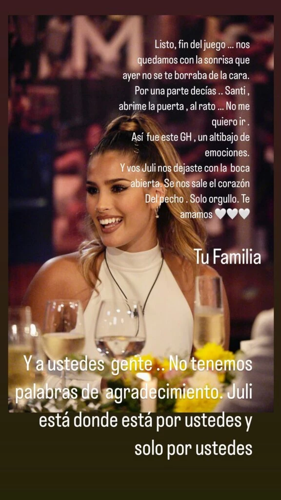 Por otro lado, la familia de Julieta realizó una campaña muy fuerte en las redes sociales, donde sumó a famosos como el cantante Axel para apoyarla. Asimismo, le brindó unas palabras en agradecimiento a todo el esfuerzo realizado dentro de la casa. "Nos quedamos con la sonrisa que no se te borraba de la cara...Así fue este GH, un altibajo de emociones y vos Juli, nos dejaste con la boca abierta. Se nos sale el corazón del pecho. Sólo orgullo", afirmaron desde Instagram.