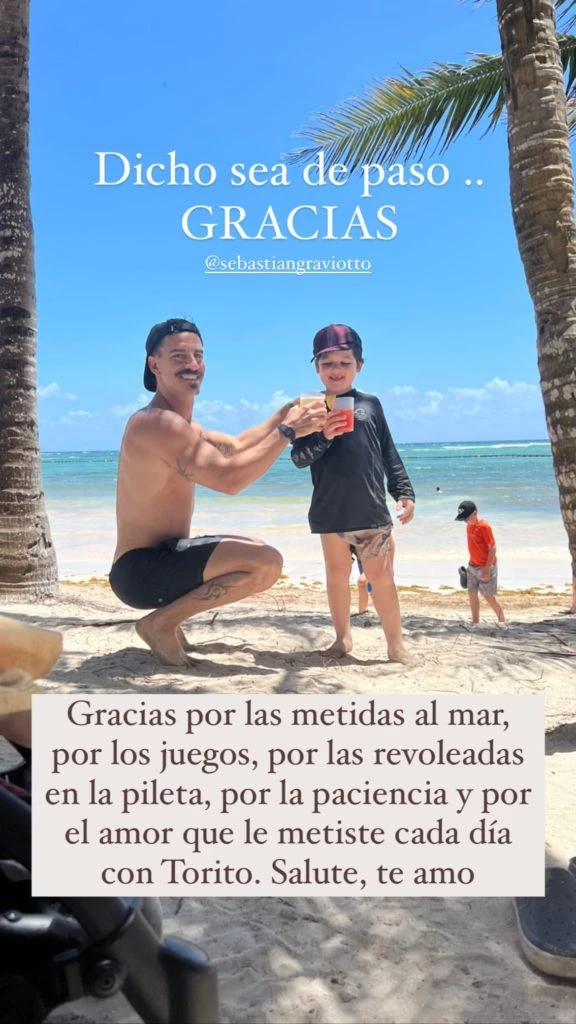 "A pesar de que casi me muero de un infarto (Nótese que casi tiro el teléfono cuando veo lo que estaban haciendo)", escribió Repetto junto a las imágenes donde se ve el perfecto clavado de Toro. Lo llamativo de todo esto es que, años atrás, el niño tenía un miedo irracional al agua, algo que superó con clases de natación y gracias al "flota flota".
