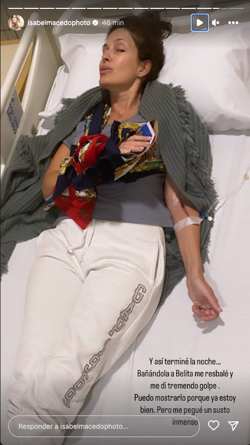 "Y así terminé la noche... Bañándola a Belita me resbalé y me di tremendo golpe", comenzó explicando la modelo y actriz. "Puedo mostrarlo porque ya estoy bien. Pero me pegué un susto inmenso", añadió. En la foto, se la ve recostada en una cama sanatorial, con una vía en uno de sus brazos y el otro entablillado a la altura de la muñeca.