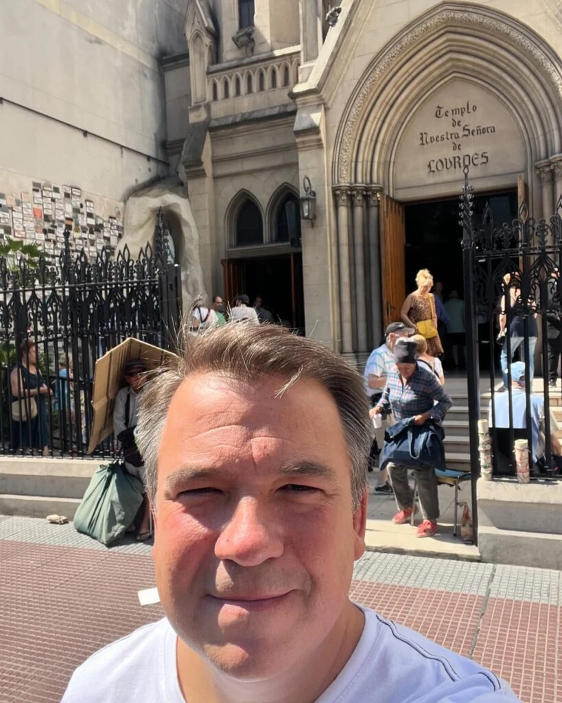 En el posteo, el periodista deportivo compartió una selfie con la Parroquia Virgen Inmaculada de Lourdes de fondo y un emotivo relato: