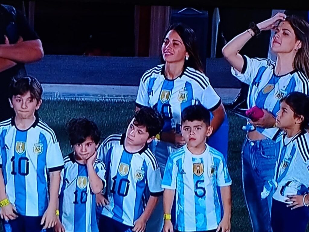 Sus hijos, Thiago, Mateo y Ciro también lucieron camisetas argentinas y se ubicaron junto a su papá en momento del himno nacional argentino. Antes de bajar al cesped, a Antonela y sus chicos se los vio en el palco junto a Celia Cuccittini, la mamá de Lionel Messi y otros familiares.