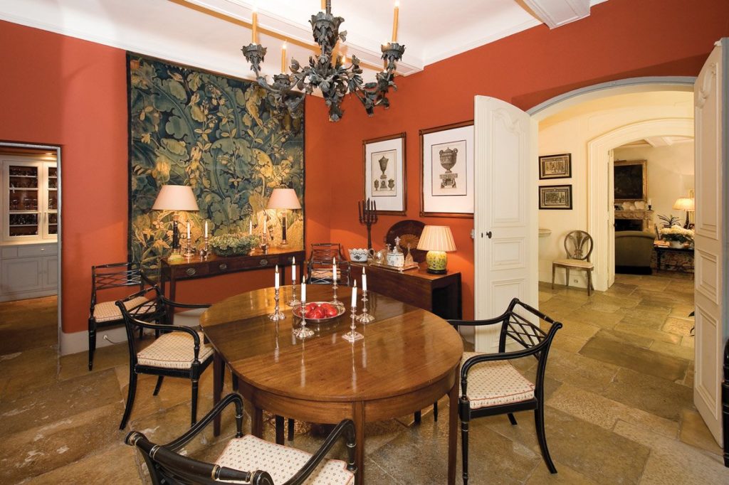 Elegantísimo, el comedor con mesa y sillas de estilo. El piso de piedra suma en esta casona provenzal.