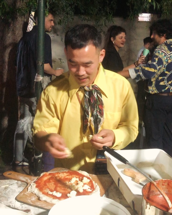La celebración continuó con una ceremonia al aire libre que se realizó por la noche, donde los novios cambiaron de look: la novia llevó un vestido strapless de largo a la rodilla con zapatos en rojo. El novio, una falda gris con un blazer negro.