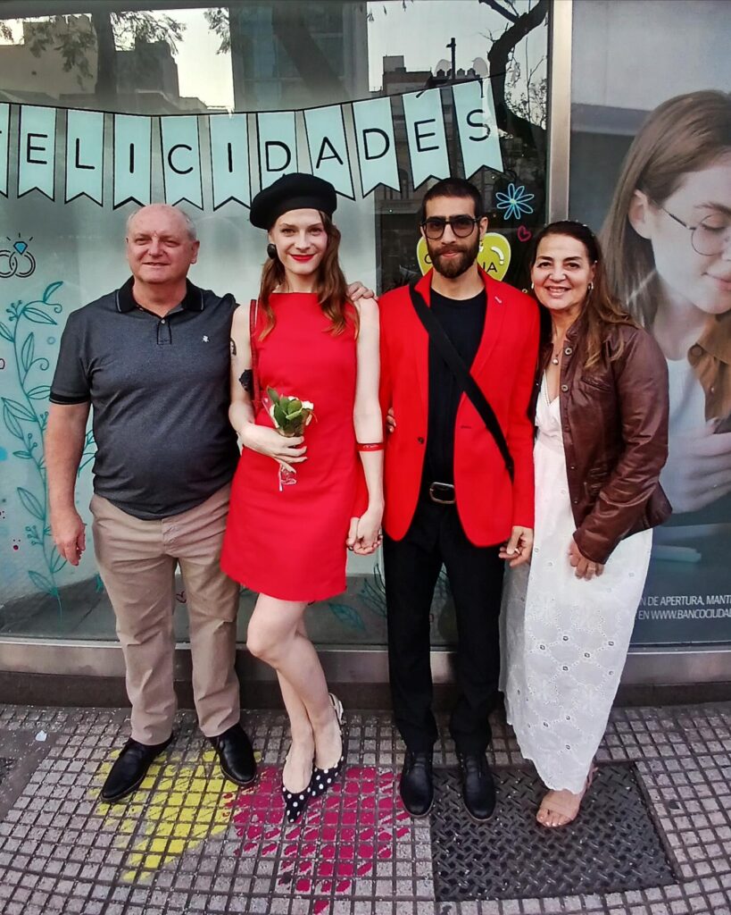 Los novios optaron para la ceremonia de unión civil por looks en rojo y negro. Caro llevó un mini vestido al cuerpo, zapatos negros a lunares blancos y complementó con una boina y aros.