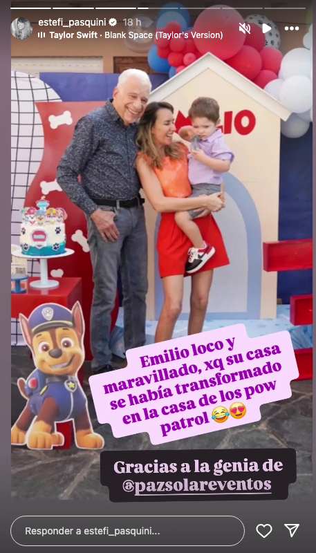"Emilio loco y maravillado porque su casa se había transformado en la casa de los Paw Patrol", escribió la nutricionista en una foto donde aparece la feliz pareja con su hijo al lado de la torta.