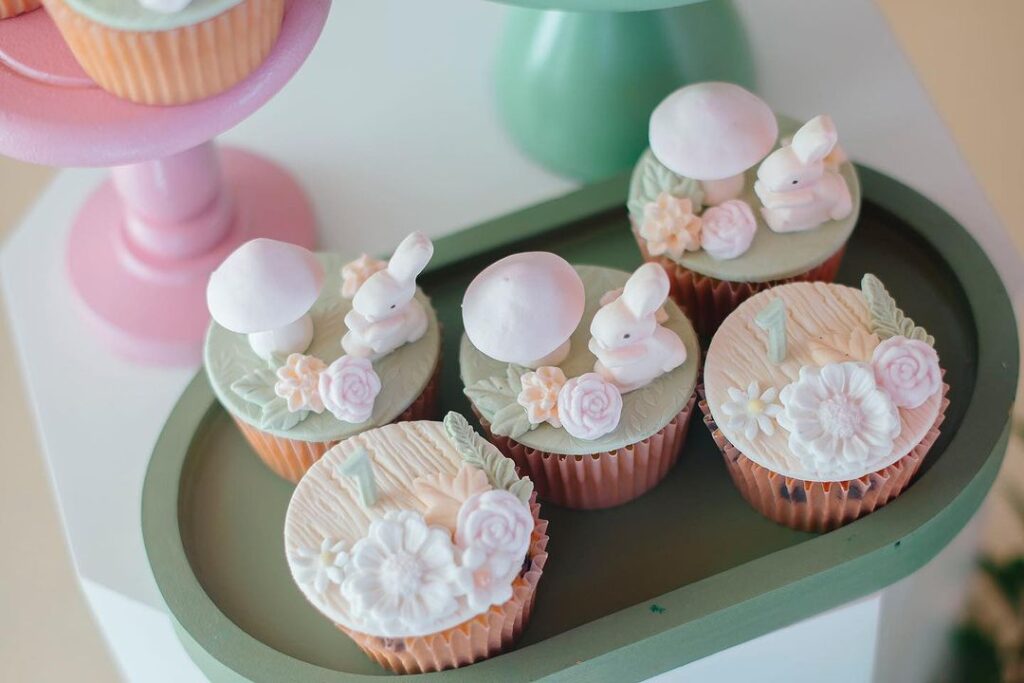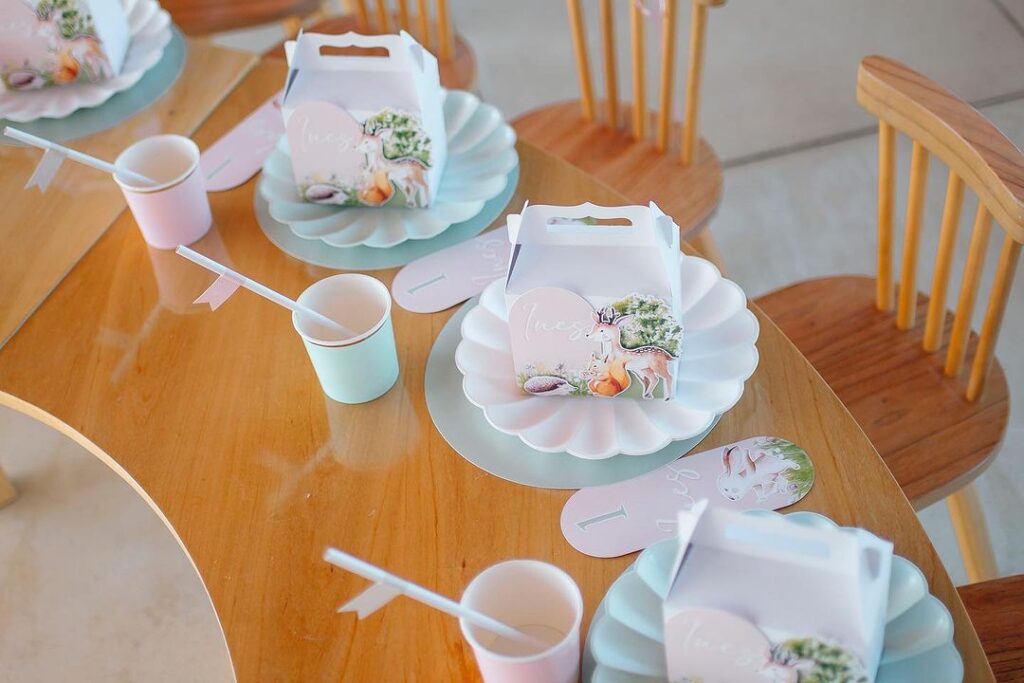 La mesa dulce estuvo conformada por paletas, galletitas, cupcakes, entre otras delicias, mientras que la torta de dos pisos contó con decoración floral y figuras de animales. El mobiliario infantil consistió en mesas y sillas de madera, hubo mini carpas, peloteros y juegos de estilo Montessori.