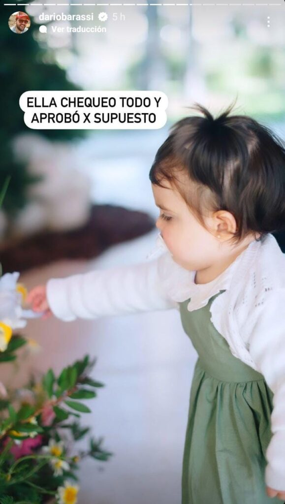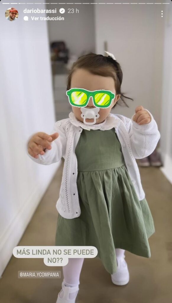La pequeña lució un vestido en tono verde militar, un saquito tejido en blanco, medias y sandalias blancas. Además, Inés llevó el cabello peinado con una hebillita, dando como resultado un look muy coqueto y divertido. Por medio de Instagram Stories, Barassi dejó ver por primera vez el rostro de su hija, donde se puede ver un gran parecido con él y su hermanita, Emilia.