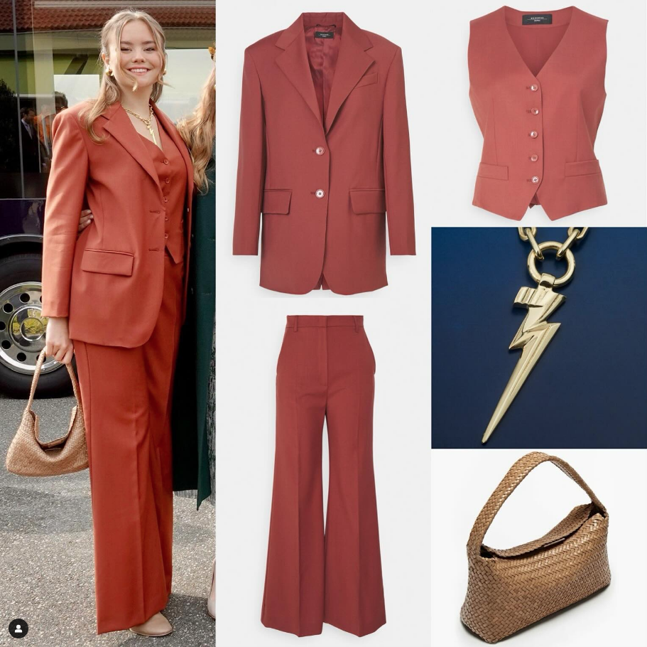 Y la más pequeña, Ariane, que ya tiene 17 años, causó impacto con un traje sastrero de tres piezas en tono terracota claro de Max Mara y una cartera de fibra natural de Massimo Dutti. Como joya, llevó un collar con importante dije, de Aracano Jewelry.