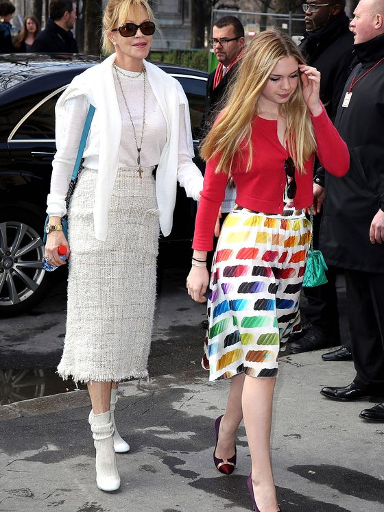 Antes abrazaba sin miedo el color, como cuando acompañó a su madre a un desfile de Chanel enfundada en un vestido de coloridas manchas de la maison francesa, que combinó con bolso verde de Chanel.
