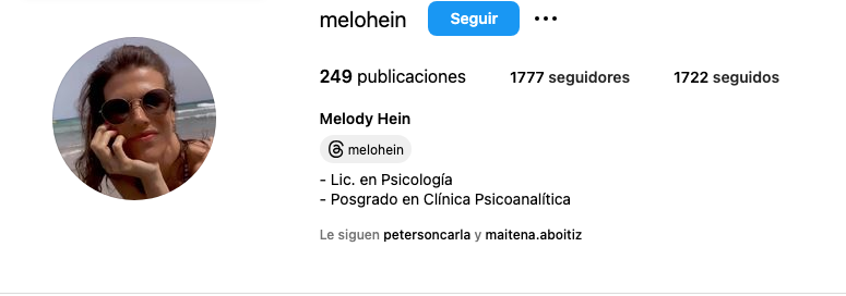 Si bien no se conocen muchos datos acerca de la vida de Melody Hein -la joven tiene el perfil de Instagram privado-, sí trascendió que es psicóloga y tiene un posgrado en clínica psicoanalítica.