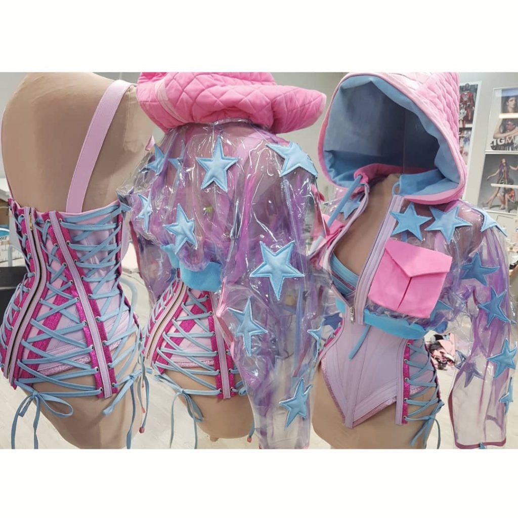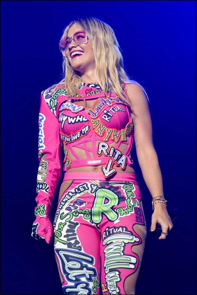 Trajes a medida y personalizado como el que usó Rita Ora en su último show en el salón Kresimir Cosic en Zadar, Croacia, muy pocos… ¡Ninguno! La cantante usó un conjunto diseñado exclusivamente para ella por el creador croata Juraj Zigman con todos los singles de la cantante estampados sobre el traje, corset y medias, 100 % rosa shocking.