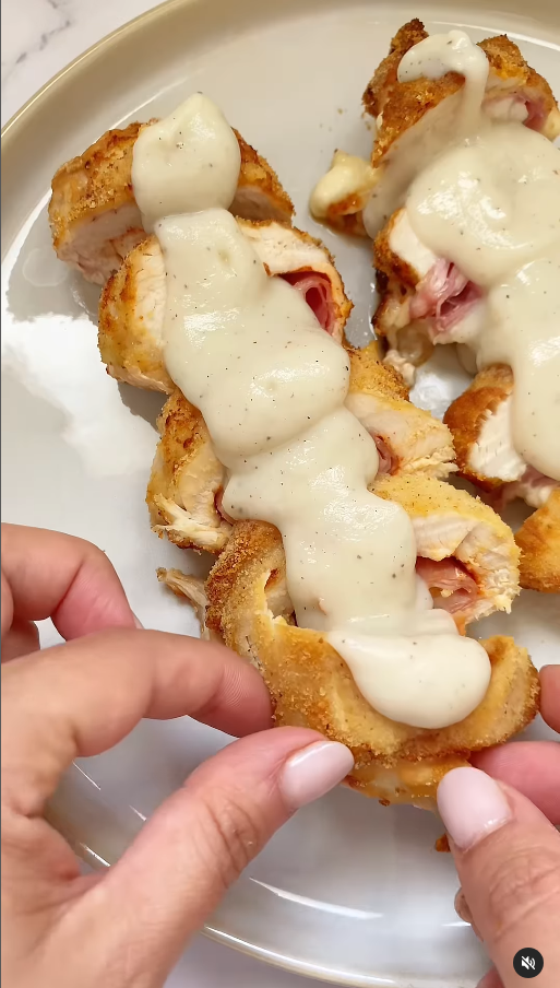 Rollitos de pollo con jamón y queso y salsa de coliflor