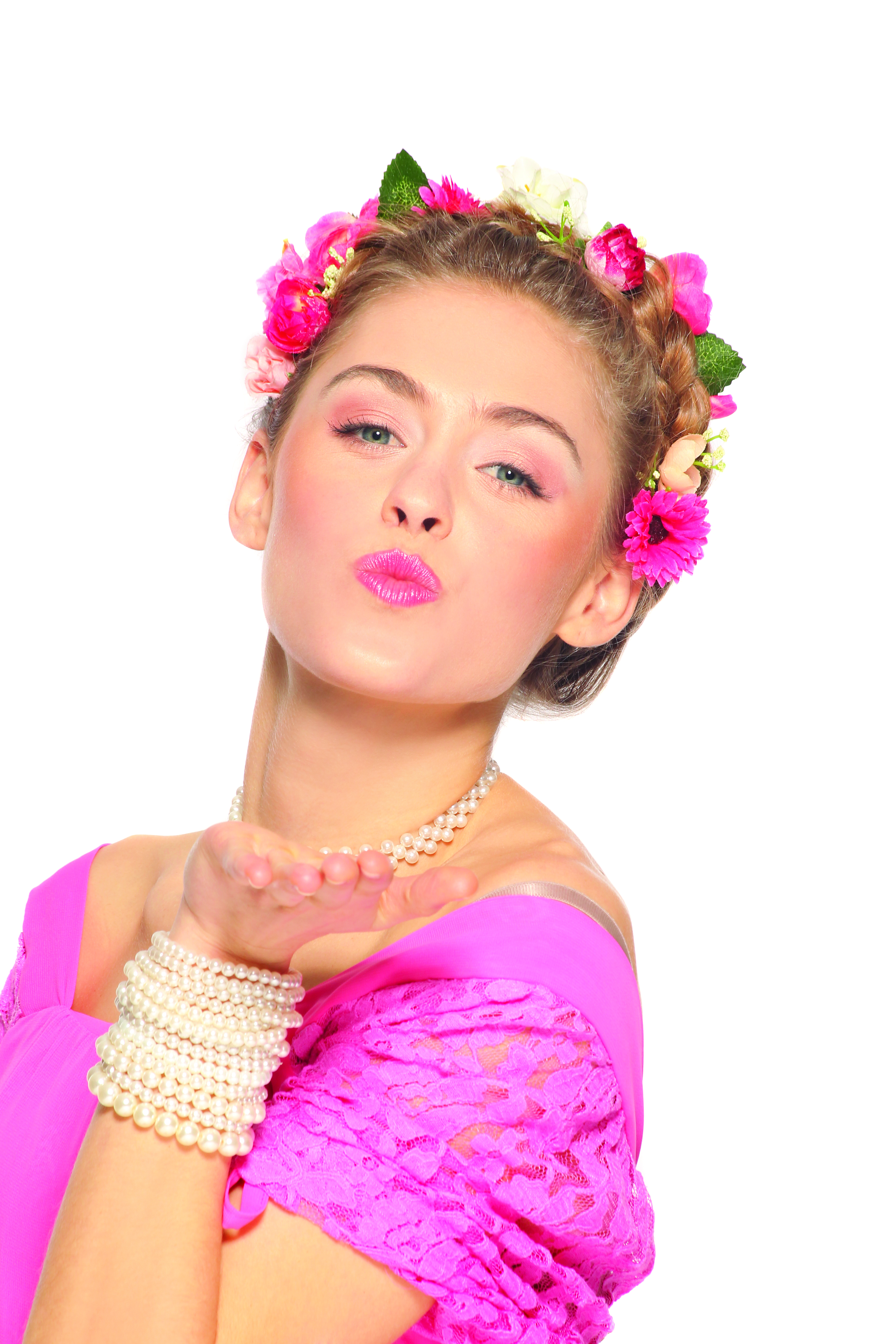Corona de trenzas de estilo romántico, con flores entrelazadas. Con ojos perlados, piel satinada y boca rosada.