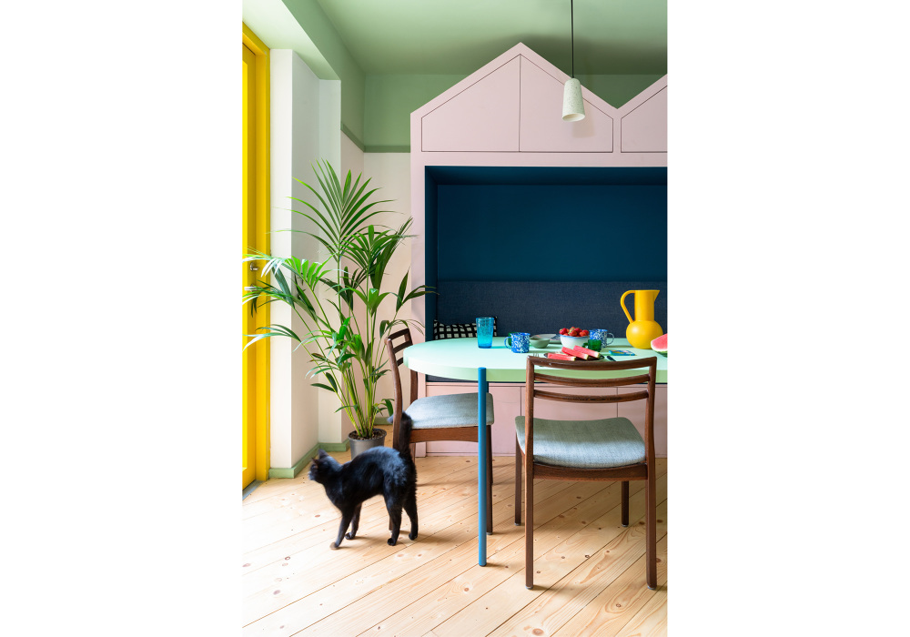 Además, cada mueble tiene una doble función. Un banco rosa y azul con dosel actúa como asiento de comedor, acogedor rincón de lectura, lugar de almacenamiento o estante para mostrar objetos sentimentales de la familia.