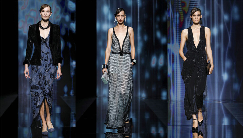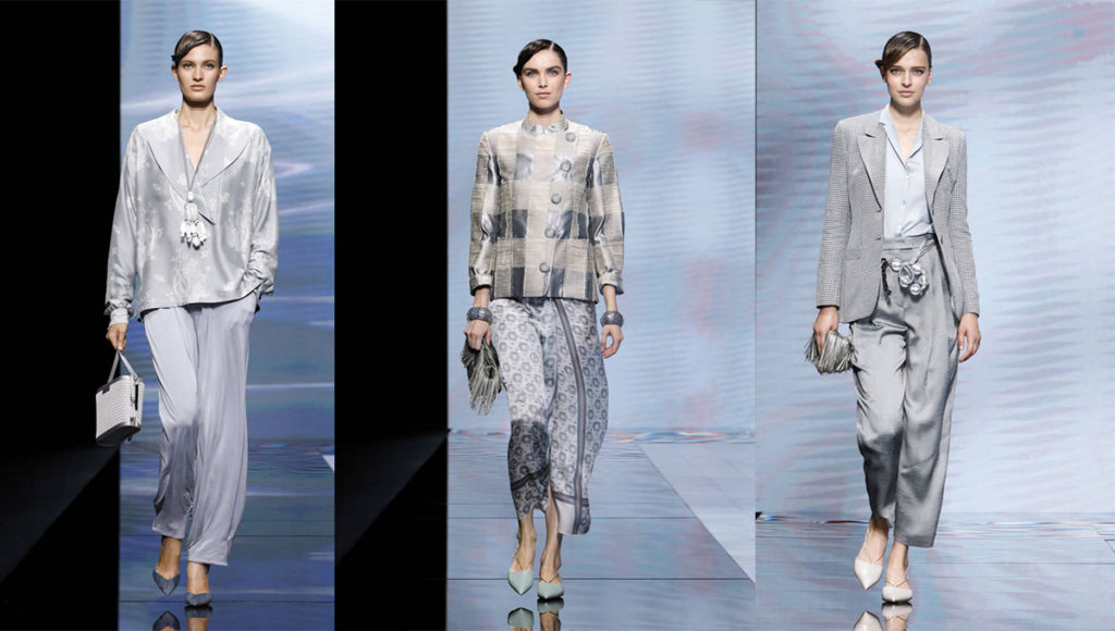 La colección mantuvo el ADN de Emporio Armani: diseños minimalistas y elegantes. Trajes de pantalón, chaquetas cortas con cuello redondo, blusas de seda y organza en gris pálido, beige, azul claro y verde, y una línea de noche con mucho brillo y glamour.