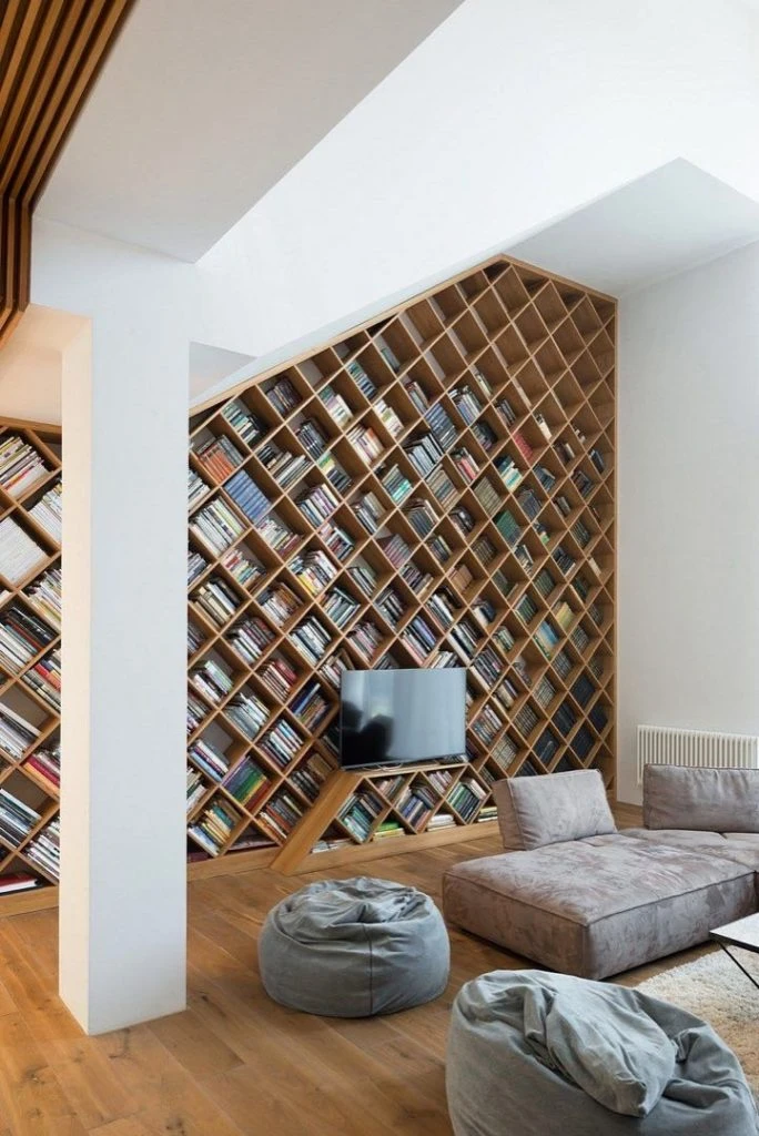 ¿Quién dijo que las bibliotecas tienen que ser rectas? Este diseño con los estantes que se cruzan en diagonal, hace la diferencia. Los libros se acomodan parados o recostados, en una composición llena de color y movimiento.