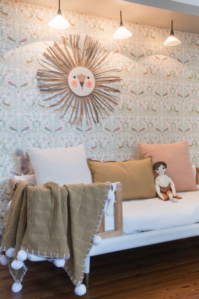 MURALES. Un cuarto decorado por @boscolacasita, con un catre heredado, con manta (@happy._fox) y almohadones (@madisonmarketbsas. ¿La protagonista? La pared con empapelado (@photowall_sweden).