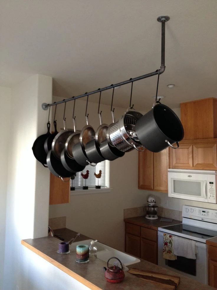 Probá colgar del techo algún soporte que te ayude a guardar y organizar determinados accesorios, como las ollas.