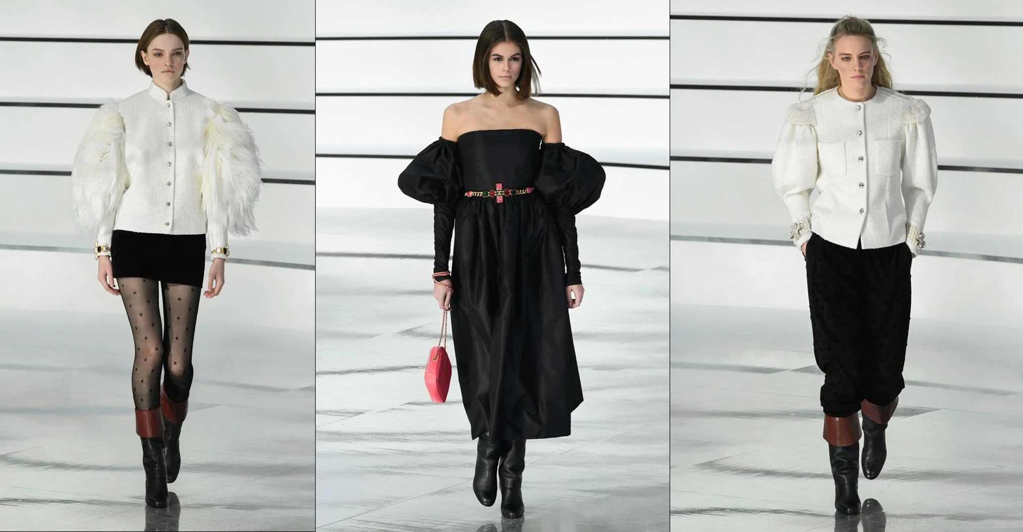 Las mangas protagonizaron varios looks. Con formas más abullonadas, oversize y algunas de plumas aggiornaron las clásicas camisas blancas y los vestidos de noche de la maison.