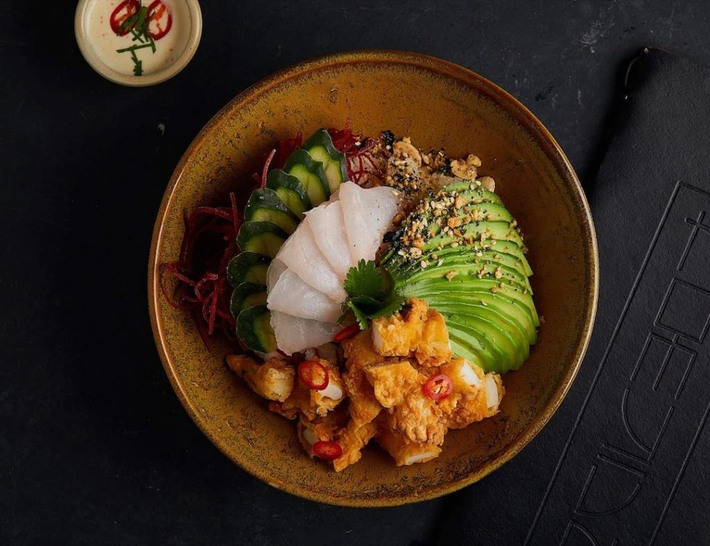 El Poke Bowl Acevichado con rabas, palta, pesca del día y salsa acevichada. Foto: Gentileza Komyun