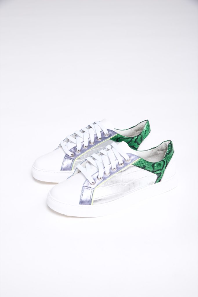 Zapatillas combiandas con reptil ($ 10.900, Carmela Achaval).