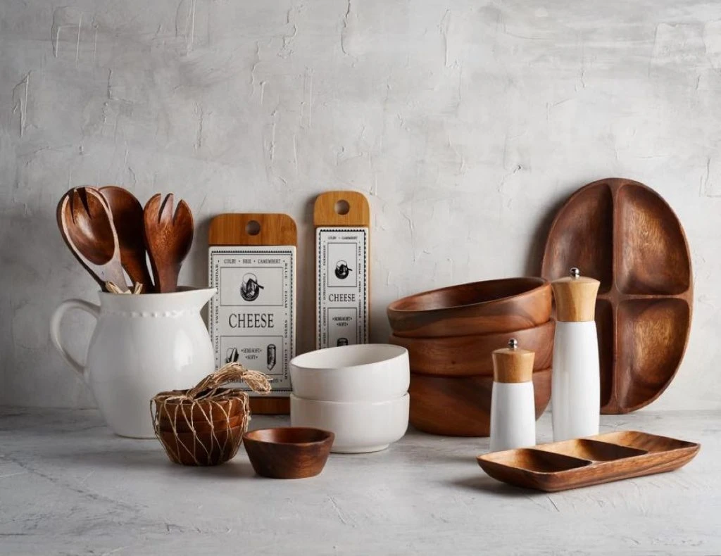 Cubiertos de madera acacia línea Manila set x 2, 31.5CM, tabla de cerámica y madera Bamboo para queso, jarra Queen blanca crema, bowl de porcalana blanca labrada borde dorado ($749, $ 749, $ 1.249 y $ 1.299, respectivamente, Binah Deco, @binahdeco)