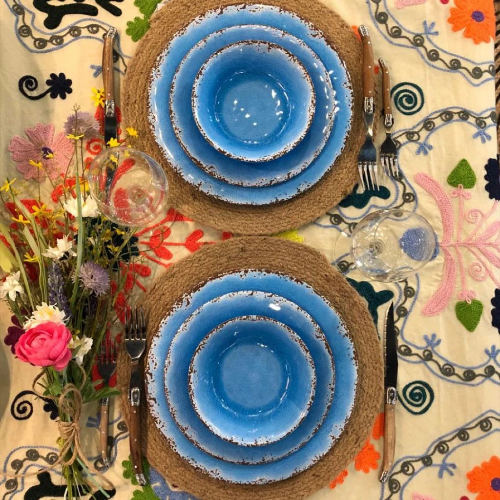 Platos playos de cerámica set x 4, de postre set x 4 y bowls set x 4 ($ 2.500, $ 1.890 y $ 1.890 respectivamente, Villatte La Maison, @villattedeco)