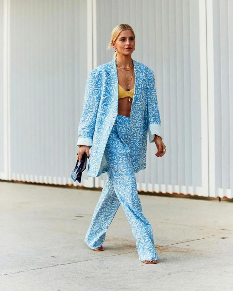 Y nos llamó la atención porque ese outfit ya lo habíamos visto previamente. Se trata de un saco oversize con pantalón amplio y estampa en color celeste. Dua Lipa lo combinó con un soutien amarillo patito tal como lo había presentado Jacquemus en su desfile.