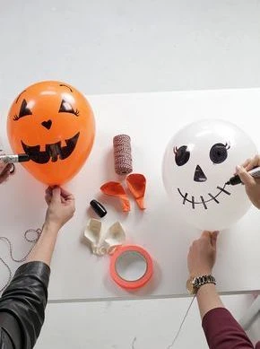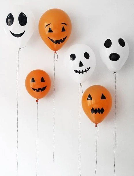 Todo lo que necesitas son algunos globos naranjas y blancos y un marcador indeleble negro y cordel. Inflá los globos y dibujá ojos, nariz y bocas tenebrosas. No tenés que ser una genia del dibujo: con una línea semicircular con rayitas de tanto en tanto es suficiente para la boca, un triángulo en la nariz y unos círculos para los ojos son suficiente.