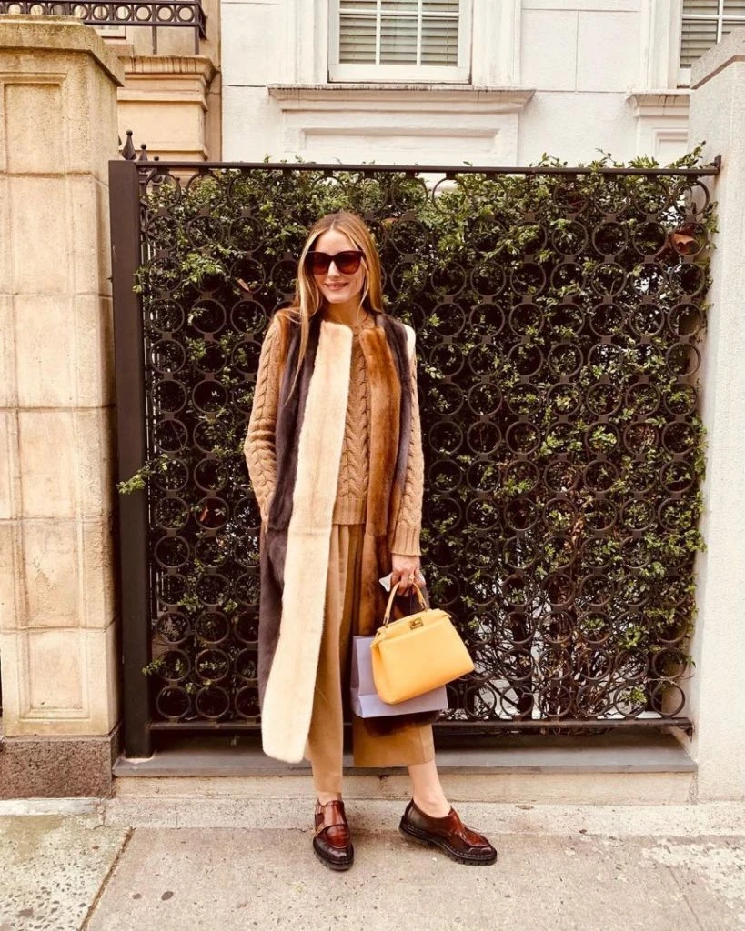 Suéter tejido en ochos y pantalón de plush en camel a los que sumó un chaleco XL de piel ecológica en marrón y natural, complementó con una cartera de mano en amarillo, en armonioso contraste con el marrón intenso de los mocasines.