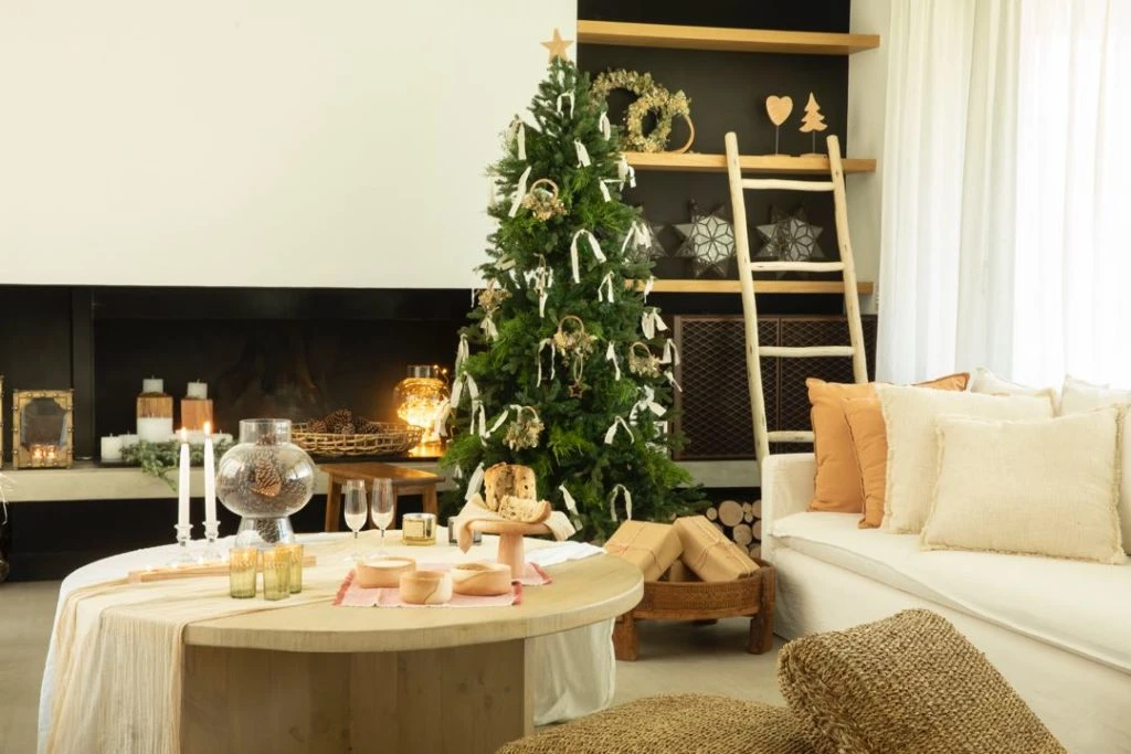 El árbol de Navidad es un pino artificial decorado con cintas de gasa natural, adornos de madera (@wanamadeco) y pequeñas coronas de mimbre y flores preservadas (@blumen.blau).