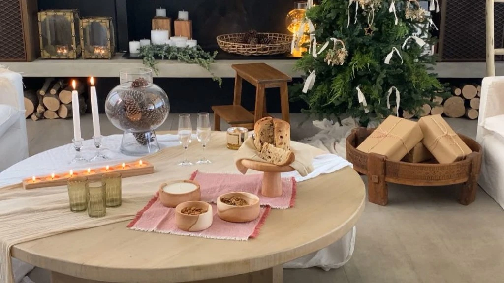 Otros accesorios: boles y pie de torta en madera (@co_casaorganizada), “fusta” de velas (@llum.velas), vela dorada (@wanamahome), florero redondo con piñas (@gloriaatelierdeco), candelabros de vidrio con velas blancas (@lucilah_deco) y vasos color verde de vidrio labrados (@landmark).