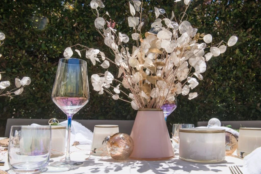Los arreglos: “Como centro de mesa utilizamos velas blancas y floreros armados con lunarias y ramas de eucaliptus pintadas en dorado de @piuavantiflowerbox”, cuentan las creadoras de esta mesa de celebración.