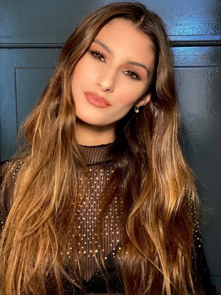 Los ojos se colorearon con sombras en tonos dorados y cobres. El párpado móvil se maquilló con un tono claro y lueg se aplica mucha máscara de pestañas. En la boca se colocó un tono nude mate.
