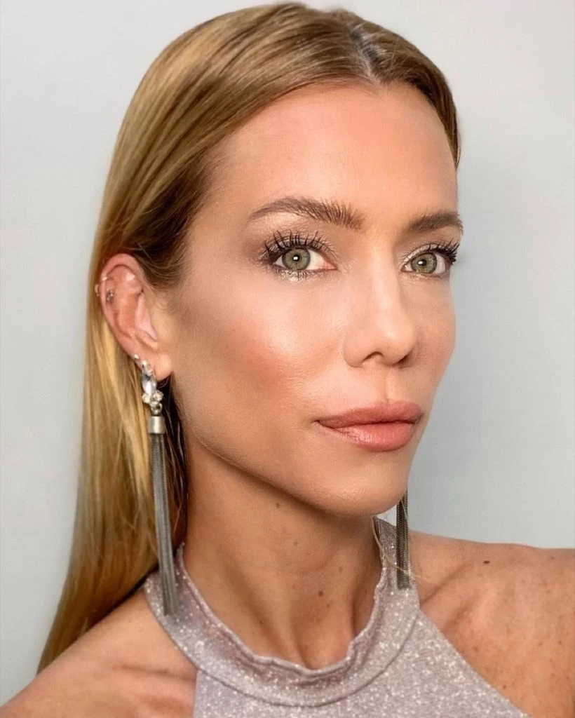 Los labios se maquilaron en un tono nude cremoso, y los ojos se trabajaron con una sombra en color visón y se aplicó sombra plateada marcando puntos de lus en el centro del párpado inferior, en el párpado móvil y en el lagrimal y se aplicó mucha mascara de pestañas para definir la mirada.