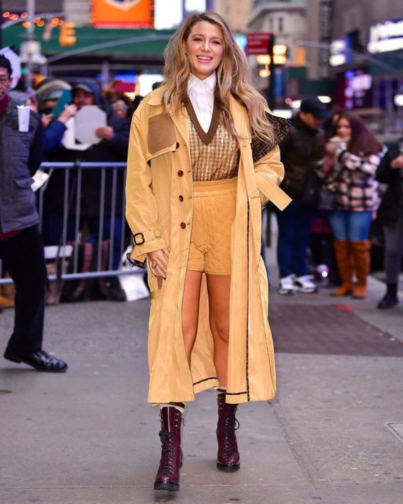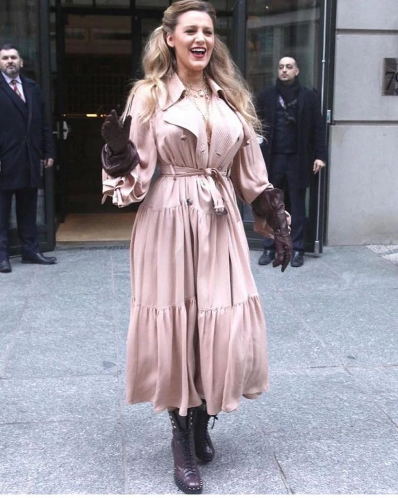 Le siguió un look audaz y bastante original: Blake Lively usó un vestido-trench en color rosa viejo. La parte superior del vestido era como un trench y la parte inferior como la falda de un vestido. Además llevaba cinto estilo piloto. Acompañó de nuevo con guantes y botas, pero esta vez cambió de modelo. Los guantes y las botas con cordones y tachas eran en color marrón.