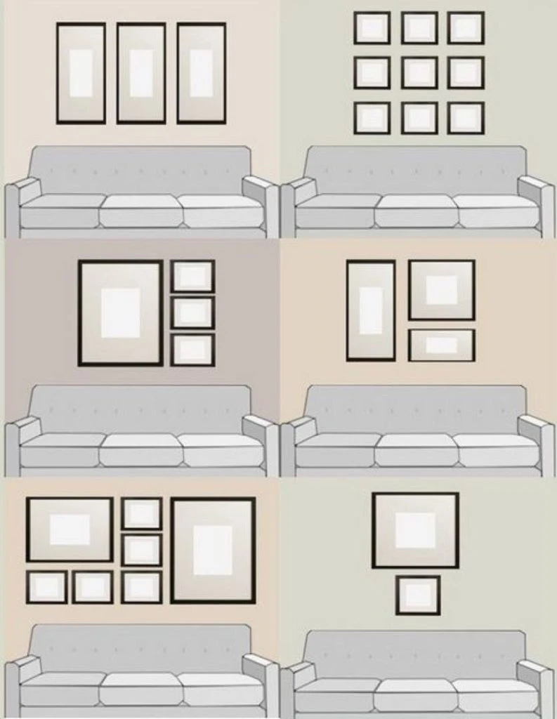 Los cuadros en línea son útiles ayudan a modificar o resaltar las proporciones de un espacio. Por ejemplo, en ambientes angostos y pequeños se recomienda colocar los cuadros verticalmente, así el techo parecerá más alto. Por el contrario, en espacios largos como un pasillo, ayudan los cuadros en líneas horizontales.