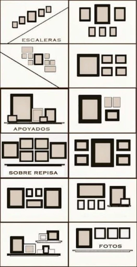 -Organizalos por áreas. Por ejemplo: una individual bien grande sobre el sillón; un grupito de 4 en el hall de entrada; una serie tipo galería acompañando el ascenso de la escalera; tres medianos sobre el respaldo de la cama. En lo posible procurá menos cantidad pero bien definidos.