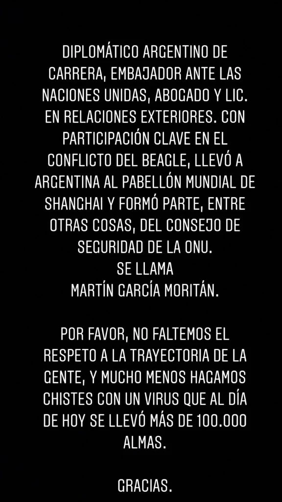 "Por favor. No le faltemos el respeto a la trayectoria de la gente, y mucho menos hagamos chistes con un virus que al día de hoy se llevó más de 100.000 almas. Gracias", termina el mensaje dejando en claro que está enojada por ciertos memes que estuvieron circulando sobre la salud del tío de Roberto.