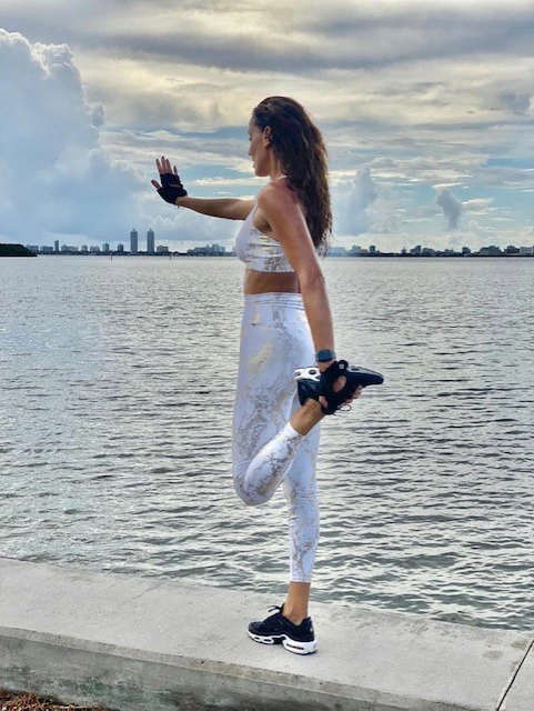 Mi entrenamiento hoy en día seria una mezcla de funcional con Boot Camp. Entreno en un parque al aire libre, al igual que yoga… todo al aire libre. Durante el momento más fuerte de cuarentena empecé a andar más en mi bici a entrenar en mi casa. Fui comprando accesorios (pecitas , bandas elásticas, bosu). Hasta tomé clases de yoga por Zoom. Como verás… ¡El entrenamiento es parte de mi vida y siempre tanto de hacer algo!