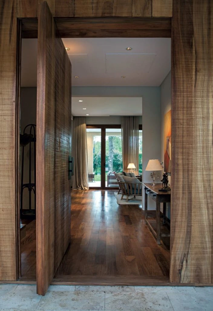 Arquitectura y paisajismo van de la mano en esta obra de Ana Heine con el toque verde de Josefina Cardoso. El frente, muestra el diseño plasmado en forma de cubos escalonados, todo revestido en Tarquini y con múltiples ventanas a modo de mirador. Dos altísimos eucaliptus custodian el acceso. Un piso granítico escalonado discurre entre los paños de una grama bahiana bien verde, con borders de dietes y salvias.