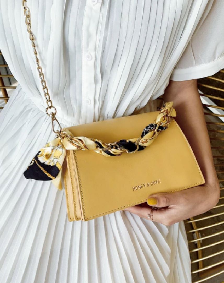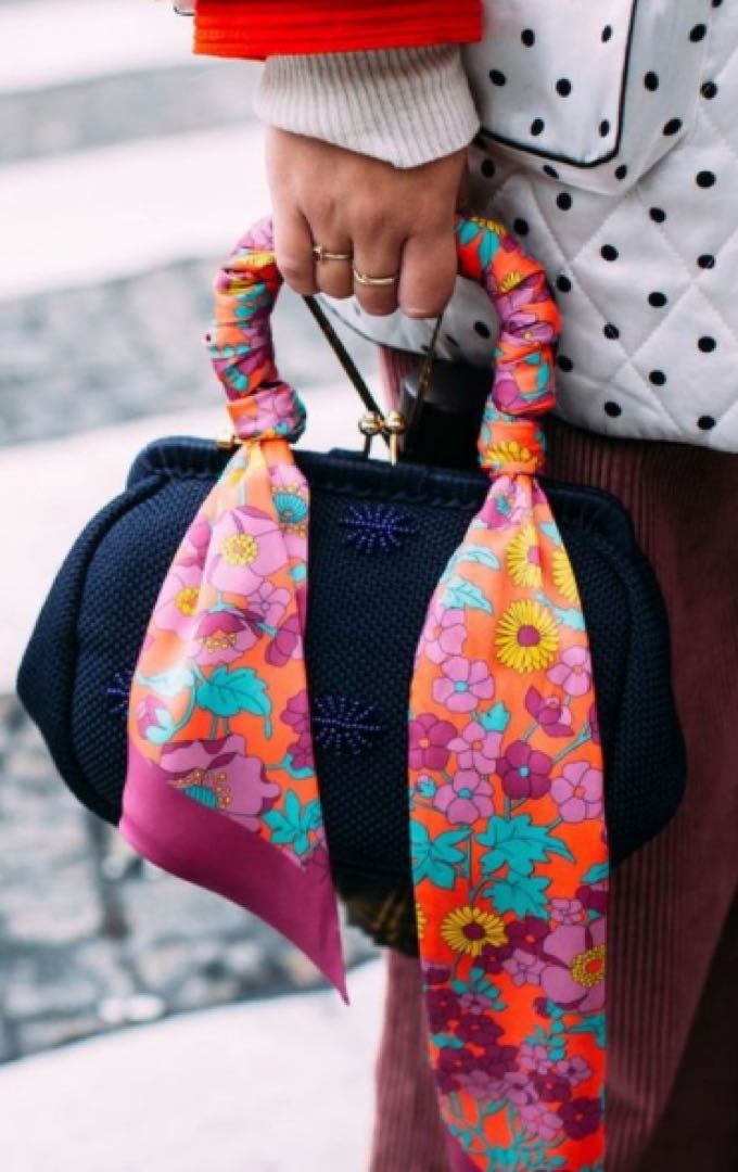 Es una manera de renovar la cartera o darle un toque personalizado: se cubren las manijas con un pañuelo de seda estampado. No importa si el color no combina con tu outfit, le dará un aire súper chic a tu look.