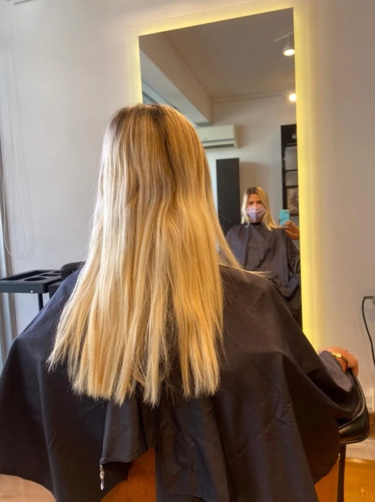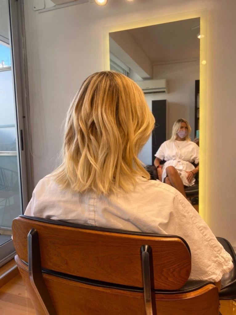 Luego del corte, emparejaron su color de pelo ya que tenía un crecimiento con mucha profundidad y a través de unos reflejos realizados con gorra se logró cubrir las raíces y hacer un rubio más parejo.